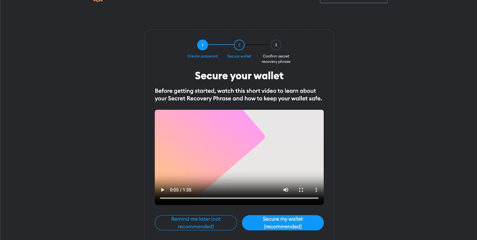 CRUCIAL: the Backup Phrase (also called Seedphrase). MetaMask will provide you with a unique set of 12 words. This is your backup phrase, vital for recovering your wallet if needed. We strongly recommend to watch the short and very insightful video!